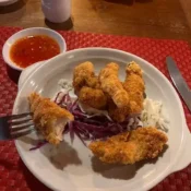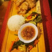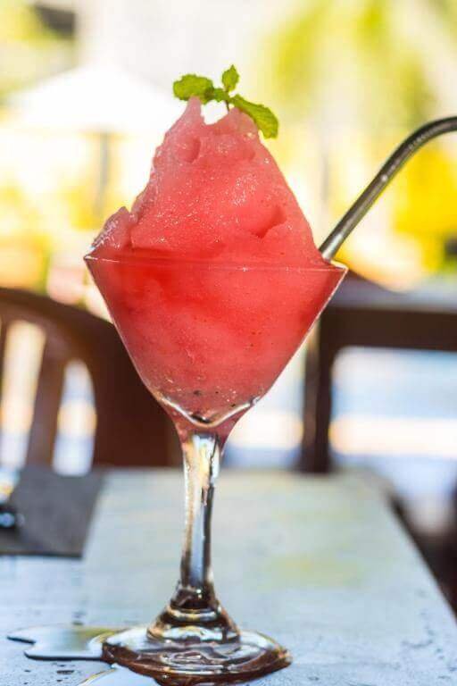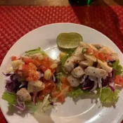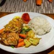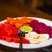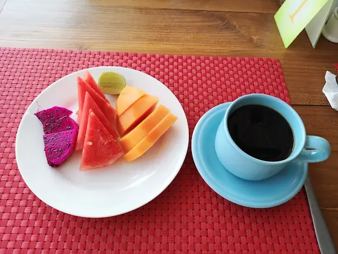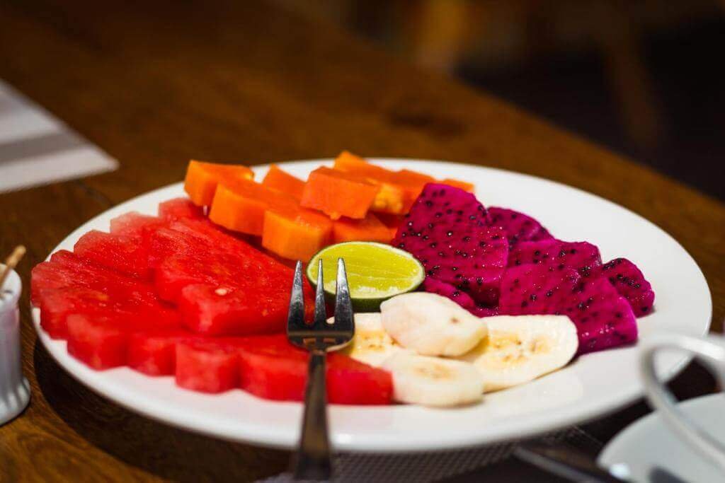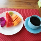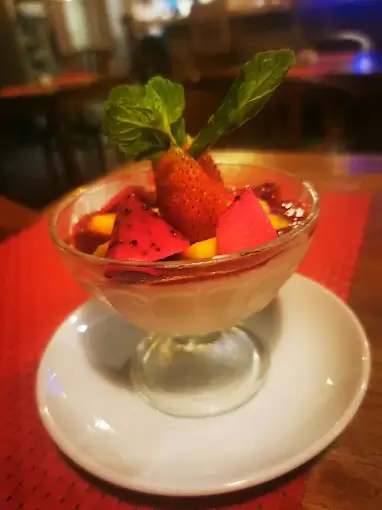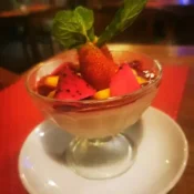 Mix tropical fruits, yogurt, choice of strawberry syrup or honey on top.