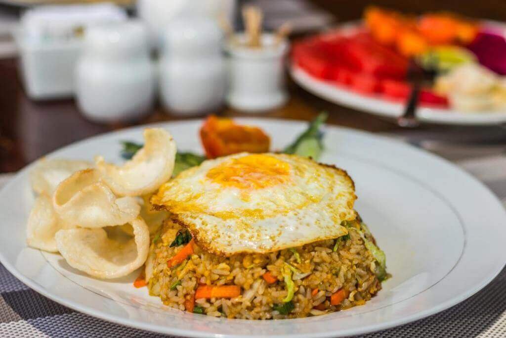 Sunny side up egg, bacon, sausage, sautéed spinach, mushroom, onion, tomato, kidney bean and sliced bread.