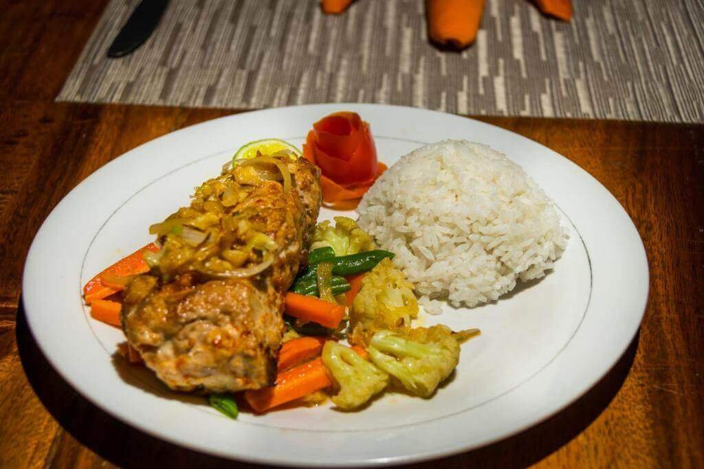 Egg omelette with onion, tomato, bacon bite inside served with simple salad and sliced bread.