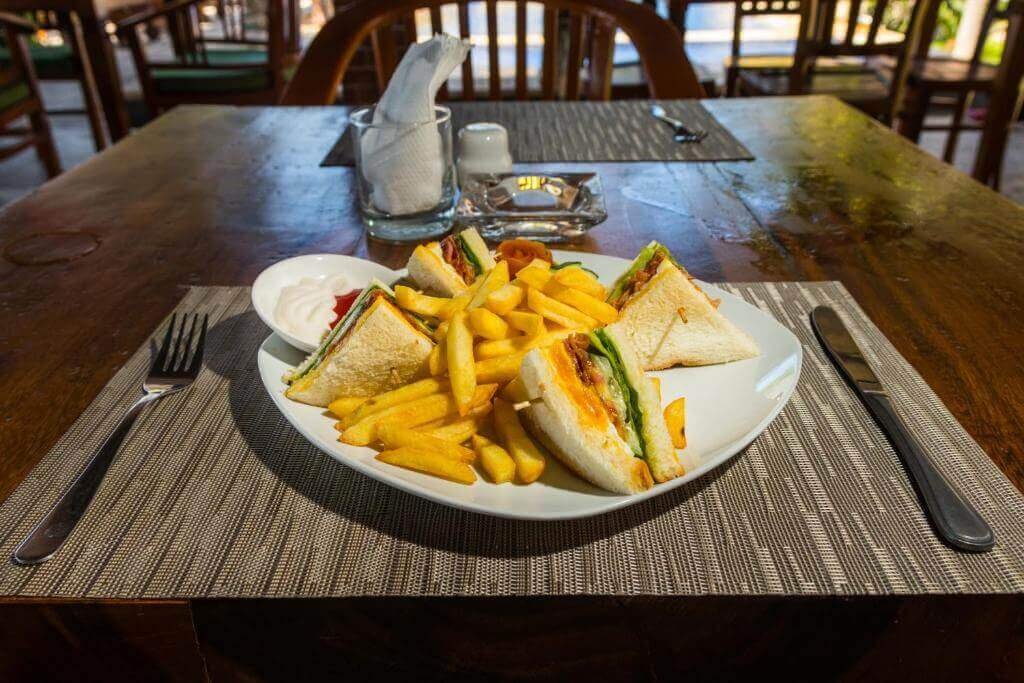 Bread sandwich with lettuce, scramble egg, tomato inside, simple salad on the side
