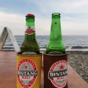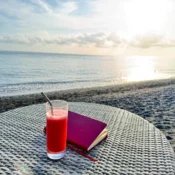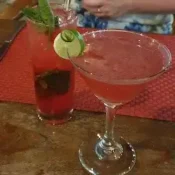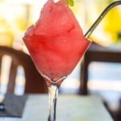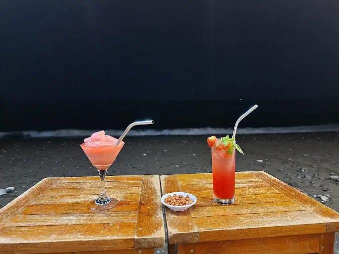 Blend of dragon fruits, banana and yogurt, top with banana, strawberry and granola.