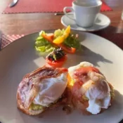 English muffins topped with poached egg, bacon, hollandaise, grilled tomato and simple salad on the side